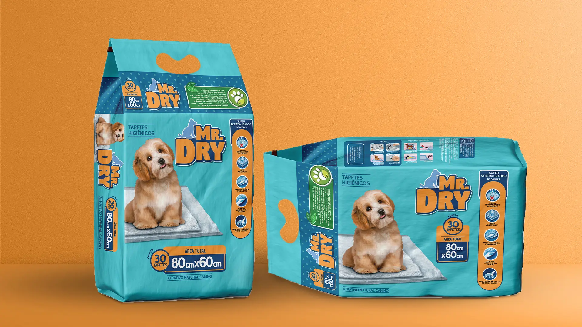 Expandimos nossa parceria com a criação da identidade da Mr. Dry, a marca de Tapete Higienico que é inovação no segmento e também referência em empatia visual. A embalagem da Mr. Dry traz não só um design atrativo, mas carrega uma comunicação afetuosa, que gera afinidade com os tutores e se conecta com o universo dos pets.